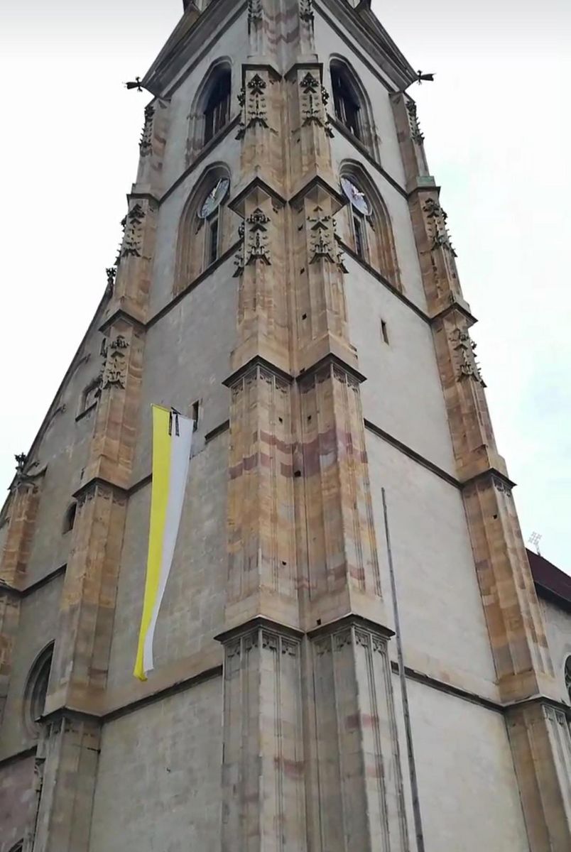 Von Mittwoch bis Samstag, 26.4. sollen an den Kirchtürmen Trauerfahnen hängen, d.h. entweder schwarze Fahnen oder Kirchenfahnen samt einem schwarzen Trauerflor.