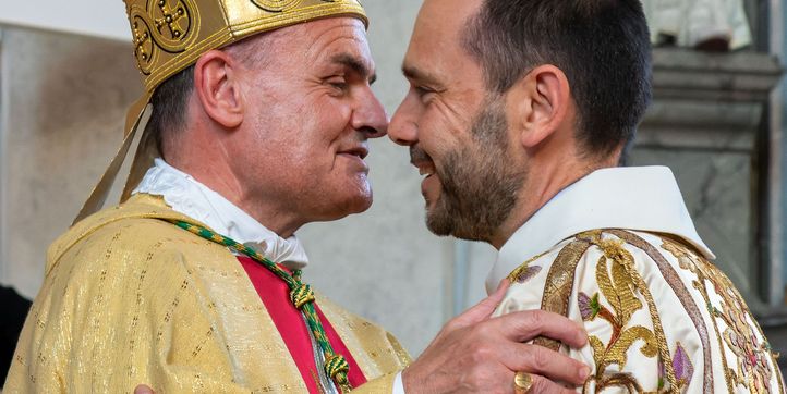 Die zweite Antwort, die ich dir ans Herz lege: „Ich gehe für die Kirche.“ Du wirst es bald merken: In deinem neuen Stand wirst du stärker mit der Kirche identifiziert als früher. Mit allem, was zur Kirche gehört, auch mit ihrem Ringen um Antworten auf heutige Fragen, mit ihren Schwächen, Fehlern und Sünden. Du musst für die Kirche einstehen. Du bist ein Mann der Kirche. Das bedeutet die Weihe: Sich auf Lebenszeit in den Dienst nehmen lassen für die Kirche, nicht eine idealisierte Gemeinschaft nach dem eigenen Geschmack und nach den eigenen Themen und Vorstellungen. Du sollst mithelfen, dass dort, wo du lebst, arbeitest, redest und auftrittst, Kirche präsent ist und ihre Strahlkraft entfaltet. Mir hat sehr gefallen, was du im Interview mit unserem „Sonntagsblatt“ gesagt hast: „Das Diakonat ist ein eigenständiger Dienst, es ist nicht der Dienst des Priesters. Der Diakon hat die Aufgabe, das Evangelium hochzuhalten. Ob nun ein Pfarrer, ein Bischof oder der Papst der Messe vorsteht – es ist der Diakon, der die Worte des Evangeliums vorträgt. Indem der Diakon das Evangelium hochhält, erinnert er die Gemeinde daran, dass christlicher Glaube untrennbar mit dem Einsatz für Gerechtigkeit, Barmherzigkeit und Menschenwürde verbunden ist. Das bezieht sich nicht nur auf den liturgischen Dienst.“