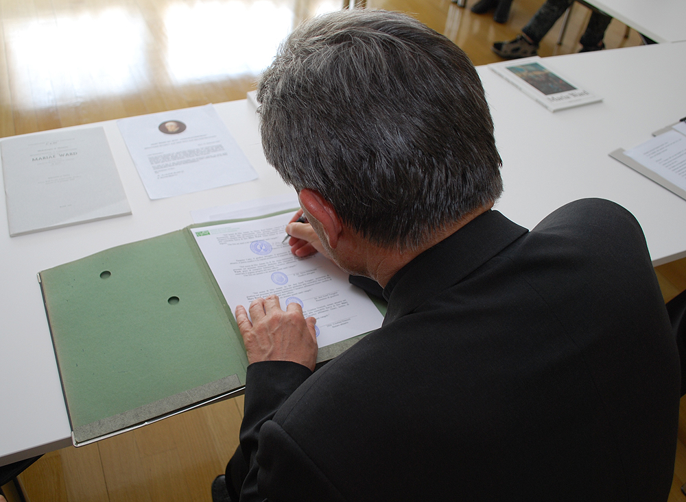 Im Rahmen des Seligsprechungsverfahrens von Mary Ward hat Bischof Karl Golseram 1. Juli 2010 ein Erhebungsverfahren über ein mögliches Wunder eröffnet. Indem Verfahren wird das Vorliegen eines so genannten Heilungswunders geprüft.Franz Putzer, 1924 in Brixen geboren, war im Jahr 1936 an einer von zwei Ärzten diagnostizierten tuberkulösen Gehirnhautentzündung erkrankt. Die Mediziner gaben den Eltern zu verstehen, dass es keine Heilungsmöglichkeit mehr gebe und das Kind in kürzester Zeit sterben würde. Darum ging die Mutter des Buben in ihrer Verzweiflung in die Kirche der Englischen Fräulein und erhielt dort ein Bildchen der Schwester Mary Ward mit einer kleinen Reliquie derselben. Die Mutter legte dieses Bild mit der Reliquie dem Buben immer wieder auf das Haupt. Zur genaueren Diagnose entnahmen die Ärzte durch eine Punktur Flüssigkeit aus der Wirbelsäule des Buben und bestätigten darauf die Prognose eines baldiges Todes. Wider Erwarten kam der Knabe einige Tage wieder zu sich und sein Zustand verbesserte sich schnell, auch blieben keine Folgen der Krankheit zurück. Der behandelnde Arzt stellte in einer folgenden Visite die volle Gesundheit des Knaben fest. Franz Putzer kam dann 1937 für zwei Jahre zum Studium in das Kapuzinerseminar nach Salern/Vahrn. Im Frühjahr 1943 musste er einrücken, bereits im Herbst desselben Jahres fiel er im Krieg. Die Meldung des Gefallenen gibt als Todesdatum den 31. Oktober 1943 an. Um die genauen Umstände der Heilung von Franz Putzer zu überprüfen, wurde von Bischof Karl Golser ein eigener diözesaner Gerichtshof bestellt, der in den nächsten Monaten alle Dokumente und Aufzeichnungen über das Ereignis sammeln und Zeugen befragen wird. Das Ergebnis der Untersuchung wird an die Kongregation für Selig- und Heiligsprechungsverfahren des Vatikans in Rom übersandt. Der Kongregation obliegt die Entscheidung, ob die Heilung des besagten Jungen als Wunder betrachtet werden kann, oder ob die Heilung eine natürliche Ursache hatte. Vorsitzender der bischöflichen Untersuchungskommission ist der Offizial der Diözese Bozen-Brixen, P. Dr. Alois Hillebrand. Dr. Josef Torggler ist als Kirchenanwalt berufen, außerdem wirken Frau DDr. Christina Grazioli als Notarin und Aktuarin, Dr. med. Josef Niederwieser alsmedizinischer Sachverständiger und Sonia Veronese als Kopierkraft an dem Verfahren mit. Ein von Rom anerkanntes Wunder ist nach dem positiven Abschluss des Tugendprozesses Voraussetzung für eine Seligsprechung. Im Fall von Mary Ward wurde das Dekret über deren heroischen Tugendgrad am 19. Dezember 2009 verkündet. Damit wurde derTugendprozess positiv abgeschlossen.Nun geht es darum, unter Mitwirkung des medizinischen Sachverständigen und weiterer Ärzte den Fall zu untersuchen und anhand der damaligen Aussagen von Seiten einer Krankenschwester und der Mutter von Franz Putzer (aufgezeichnet durch eine Englische Ordensschwester) festzustellen, inwieweit diese Aufzeichnungen den Ärzten hilfreich seinkönnen, um eine Stellungnahme zu diesem Fall abgeben zu können. Weiters werden Zeugen angehört, die über die behandelnden Ärzte von damals Zeugnis von deren Glaubwürdigkeitabgeben können, sowie Mitschüler von Franz Putzer, die nach seiner Genesung mit ihm im Seminar Salern/Vahrn waren. Besondere Bedeutung kommt den Aussagen einer Halbschwester von Franz Putzer zu, die sich aus den Erzählungen der Mutter an diesen Fall erinnert, so P. Hillebrand.