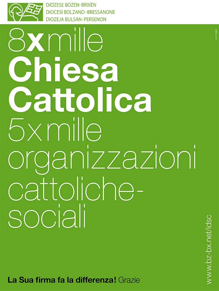 8xmille alla Chiesa Cattolica, 5xmille alle organizzazioni cattoliche-sociali - con questo slogan la Diocesi di Bolzano-Bressanone invita a firmare l8xmille e il 5xmille sulla dichiarazione dei redditi.Ogni contribuente può firmare indipendentemente dal reddito. Apporre la firma non costa niente, si assegna così una parte delle imposte e si possono aiutare numerose organizzazioni che si impegnano quotidianamente nellambito sociale, così afferma lincaricato diocesano Stefan Untersulzner.In Italia l8xmille dellIRPEF versato dai contribuenti viene assegnato dallo Stato ad uno specifico fondo. Tra queste cè anche la Chiesa Cattolica.Il contribuente può assegnare un ulteriore 5xmille a unorganizzazione sociale apponendo la propria firma sulla dichiarazione dei redditi. È necessario indicare inoltre il codice fiscale dellorganizzazione scelta.Ogni anno vengono versati quasi quattro milioni di euro dal fondo 8xmille alla Diocesi di Bolzano-Bressanone. Grazie a tale fondo la Diocesi può sostenere molte attività tra cui il sostentamento del clero, le ristrutturazioni nelle parrocchie e molte attività pastorali. In merito al 5xmille la Diocesi invita ad apporre una firma per le organizzazioni cattoliche-sociali.Anche chi non fa la dichiarazione dei redditi e ha soltanto il mod. CUD può apporre la propria firma, afferma lincaricato diocesano Untersulzner. La pagina compilata del mod. CUD con apposita busta può essere consegnata in ogni ufficio postale.I volantini e le buste prestampate sono disponibili presso le parrocchie, la Curia Vescovile e la Caritas. Per ulteriori informazioni basta accedere al sito www.bz-bx.net/isdc.
