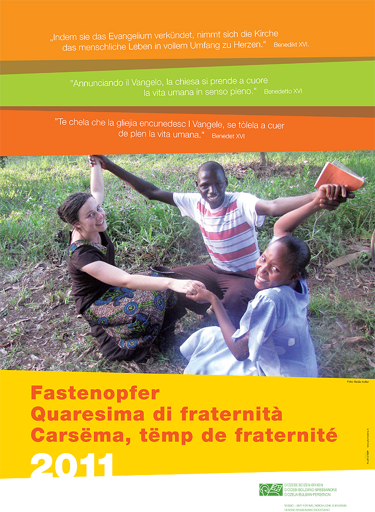 Annunciando il Vangelo, la chiesa si prende a cuore la vita umana in senso pieno: questo è lo slogan della campagna di sensibilizzazione per la Quaresima 2011, che vuole essere qualcosa in più di una raccolta di offerte.Nel 2010 sono stati raccolti nella Diocesi di Bolzano-Bressanone 412.355,14 Euro con i quali sono stati realizzati ben 39 progetti socio-pastorali e nel settore della formazione.Robert Anhof, direttore del centro Missionario dice: Offrire denaro come solidarietà al cosiddetto Terzo Mondo è unazione degna di lode e di rispetto e prosegue dicendo, dobbiamo però porre attenzione a non ritenere con troppa facilità un successo solo il fatto che la raccolta delle offerte è quantitativamente abbondante. Don Anhof sottolinea che il lavoro di solidarietà con i poveri dovrebbe portare oltre lofferta di denaro, in modo che questa divenga un offerta consapevole di solidarietà piena.