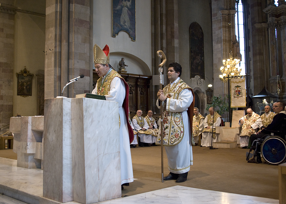 Due anni fa, l8 marzo 2009, Karl Golser e stato ordinato Vescovo della Diocesi di Bolzano-Bressanone. Per festeggiare lanniversario della sua consacrazione ha celebrato con i numerosi fedeli raccolti presso il duomo di Bolzano una S. Messa di ringraziamento. Allinizio della celebrazione, il Vicario Generale Josef Matzneller ha posto laccento sullimpegno instancabile del Vescovo Golser nel servizio alla Diocesi di Bolzano-Bressanone.Il Vicario Generale Giuseppe Rizzi ha inoltre esplicitato il duplice aspetto di questa celebrazione di ringraziamento: da una parte il ringraziamento al Vescovo per il suo impegno pastorale e il suo servizio e dallaltra il ringraziamento a Dio per la persona del Vescovo stesso. Il Vicario Rizzi ha poi invocato la benedizione di Dio perché il Vescovo possa proseguire con serenità il suo servizio pastorale.Il Vescovo, a questo proposito, ha voluto ringraziare tutte le persone che stanno pregando per la sua salute.Nellomelia mons. Golser ha espresso la sua preoccupazione per una sempre più generalizzata perdita della fede e per il numero sempre più esiguo di sacerdoti, ma ha anche parlato di segni di speranza che egli intravede nellaumento della partecipazione alla vita cristiana nelle parrocchie e nei numerosi movimenti ecclesiali.Il Vescovo ha ricordato il suo motto Cristo nostra pace con il quale auspica che i fedeli della Diocesi di Bolzano-Bressanone si riuniscano in Cristo e riconoscano in Lui la via per la vera Pace. Vedi anche un servizio di Telepace