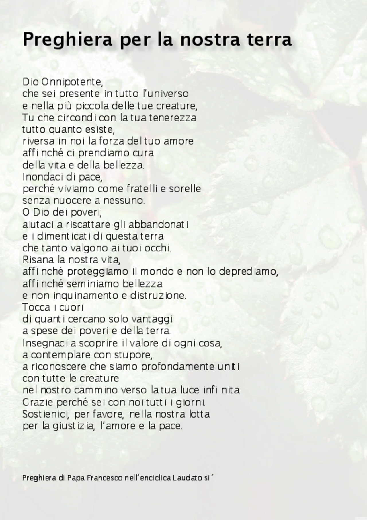 La preghiera si trova nella parte finale dell'enciclica Laudato si' ed è formulata come preghiera aperta e utilizzabile a livello ecumenico.